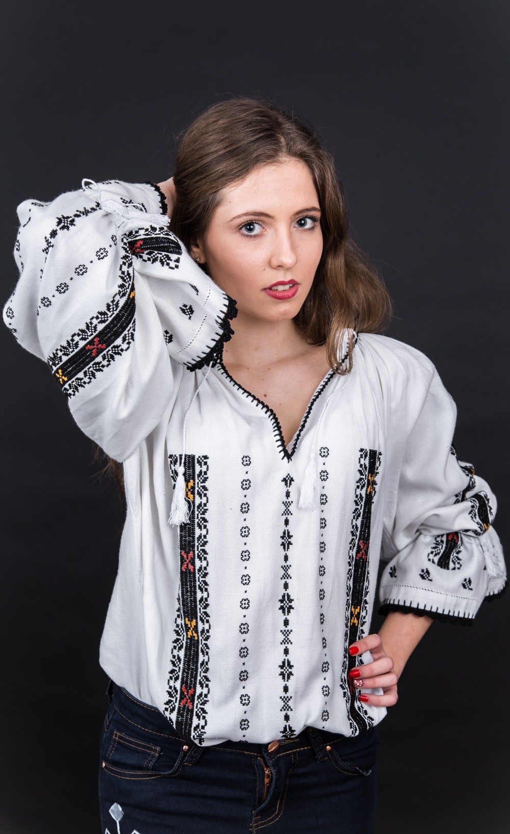 Ia este brodata manual cu culorile negru, galben, rosu si cu motive populare romanesti deosebite.